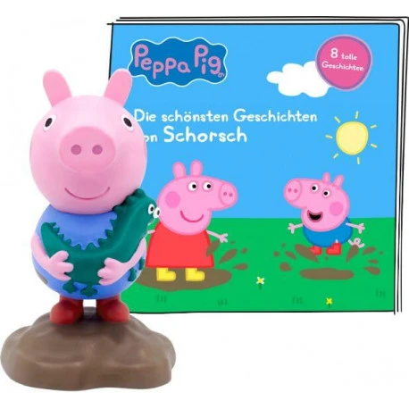 ““Hörfigur für die Toniebox: Kurze Geschichten für große Schweinchen-Fans – Peppa und ihre Familie und Freunde kommen auf die Toniebox! Sie ist klein, pink und liebt Matschepfützen über alles: Peppa Wutz begeistert mit ihren kurzen Geschichten schon die kleinsten Hörspielfans. Und jetzt kommt ihr kleiner Bruder Schorsch. Erlebt mit ihm und Peppa tolle Abenteuer: es geht zu Opi Mümmels Leuchtturm, zu Edmund Elefants Geburtstagsparty oder ins aufregende Mini-Land– stell Schorsch einfach auf deine Toniebox und begleite ihn und seine Familie und Freunde auf 8 lustigen Abenteuern. 1. Baby Alexander Peppas Cousine und Cousin kommen zu Besuch. Doch mit Baby Alexander ist zu klein und kann noch nicht sprechen. Bis Peppa ihm sein erstes Wort beibringt. 2. Champion Pappa Wutz Als Papa seinen Titel als Champion im Matschpfützenspringen verliert, ist er sehr traurig. Bis ihm alle dabei helfen, den Titel zurückzuholen. 3. Schakka-Lakka-Bumm Madame Gazelle bringt Instrumente mit in die Spielgruppe, damit die Kinder musizieren können. Die Instrumente machen „schakka und „lakka und „bumm! 4. Der Laster von Herrn Fuchs Herr Fuchs bringt Freddie zu Peppa, damit die Kinder Fahrrad fahren können. Und alle Kinder versuchen zu erraten, was Herr Fuchs wohl alles in seinem großen Laster haben könnte! 5. Sonne, Strand und Schnee Peppa, ihre Freunde und ihre Familie freuen sich auf einen Ausflug zum Meer. Aber als sie dort ankommen, liegt am Strand Schnee! 6. Opi Mümmels Leuchtturm Opa Wutz nimmt Peppa, Schorsch und Klausi Kläff mit auf einen Auszuflug zu Opi und seinem Leuchtturm. 7. Edmund Elefant feiert Geburtstag Peppa und ihre Freunde helfen bei der Geburtstagsparty von Edmund Elefant, aber das ist schwieriger, als sie gedacht hatten… 8. Das Mini-Land Es ist Zeit für einen Tagesausflug und Peppa, George, Mama Wutz, Papa Wutz und Luzie Locke besuchen das Mini-Land. Sie sehen winzige Dinosaurier, ihre liebsten winzigen Wahrzeichen und sogar ein kleines Fräulein Löffel! ““.